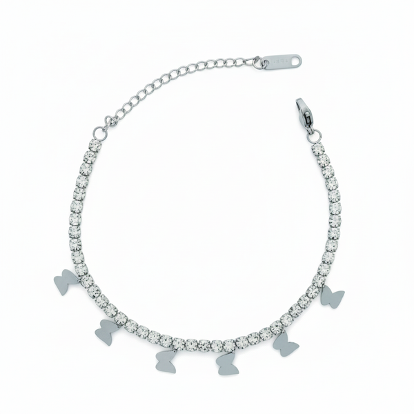 Add a touch of sparkle to your style with the Silver Crystal Charm Bracelet. Featuring delicate butterfly charms adorned with shimmering crystals, this bracelet combines elegance with playful charm.