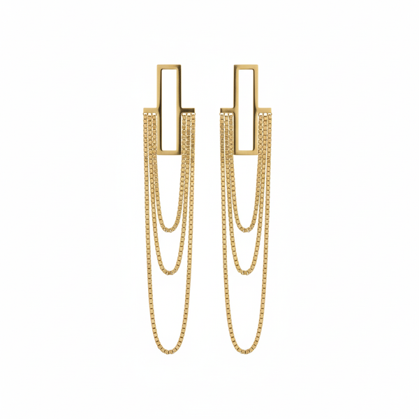 Crafted with a polished gold-plated finish, these earrings deliver a luminous shine. The cascading chain design adds depth and elegance, making them perfect for both special events and chic everyday wear.