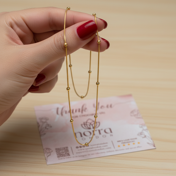 Add elegance to your everyday look with this Golden Plated Beaded Snake Chain Necklace. Designed with a sleek snake-style chain enhanced by evenly placed golden beads, this necklace combines simplicity with a modern twist. The smooth gold-plated finish reflects light beautifully, while the bead accents add a stylish touch that sets it apart from regular chains.