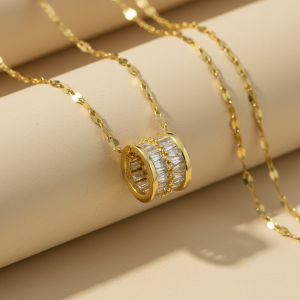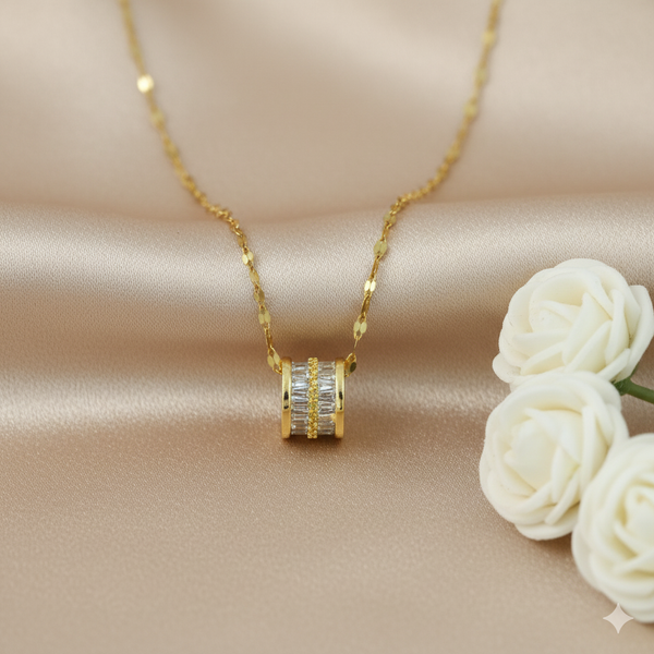 Add a modern touch to your jewelry collection with this Gold Plated Barrel Pendant Necklace. The pendant showcases a sleek cylindrical barrel design adorned with sparkling baguette-cut CZ stones, creating a perfect balance between elegance and minimalism. The detailed craftsmanship and glossy gold-plated finish make it a standout accessory for both casual and formal looks.