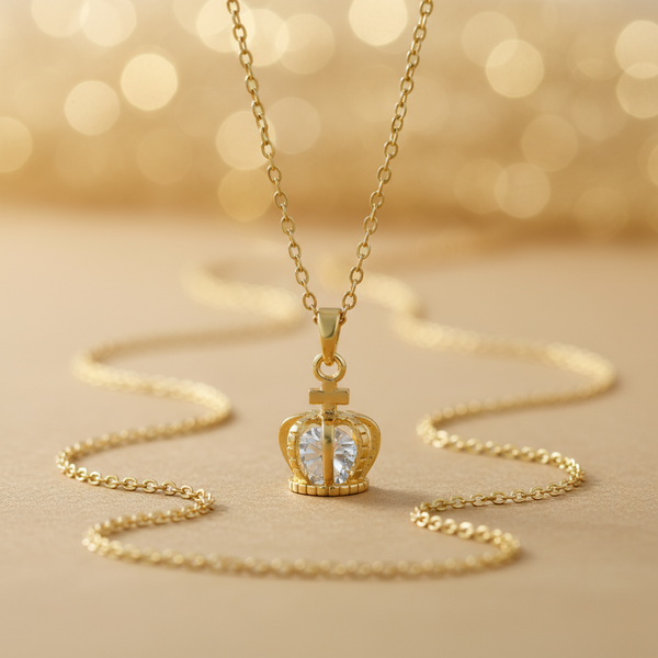 Exude grace and confidence with this stunning Gold Plated Royal Crown Pendant Necklace. Beautifully crafted to resemble a regal crown, the pendant features a clear crystal centerpiece encased in a polished gold-plated frame. Its intricate detailing and glossy finish reflect power, prestige, and timeless elegance—perfect for those who love to stand out with sophistication.