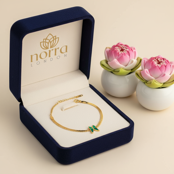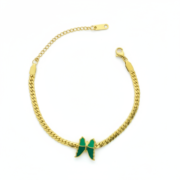 Embrace elegance and natural beauty with the Gilded Butterfly Bracelet. Featuring a delicately crafted gilded butterfly charm set with verdant enamel detailing, this bracelet is a celebration of grace and transformation.